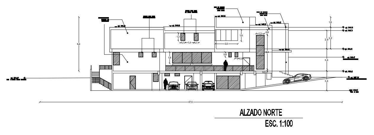 The north side elevation view of the 26x50m house building is given in this AutoCAD drawing model. This is G+ 2 house building. The vestibule, car parking, elevator, patio, driver room with attached bathroom, maid room with attached bathroom, Master bedroom with attached bathroom, guest room, and two kid’s room with attached bathroom, TV room, Vestiblue, kitchen, living room, family room, dining area, common bathroom, and garden is available. For more details download the AutoCAD drawing file. Thank you for downloading the AutoCAD drawing file and other CAD program files from our website.