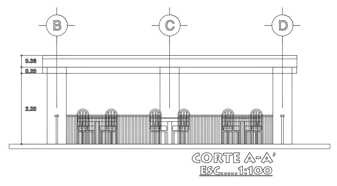 The front section view of the 9x18m restaurant building is given in this AutoCAD drawing model. This is single story restaurant building. A kitchen, dining area, patio service, and service area are available on this plan. For more details download the AutoCAD drawing file. Thank you for downloading the AutoCAD drawing file and other CAD program files from our website.