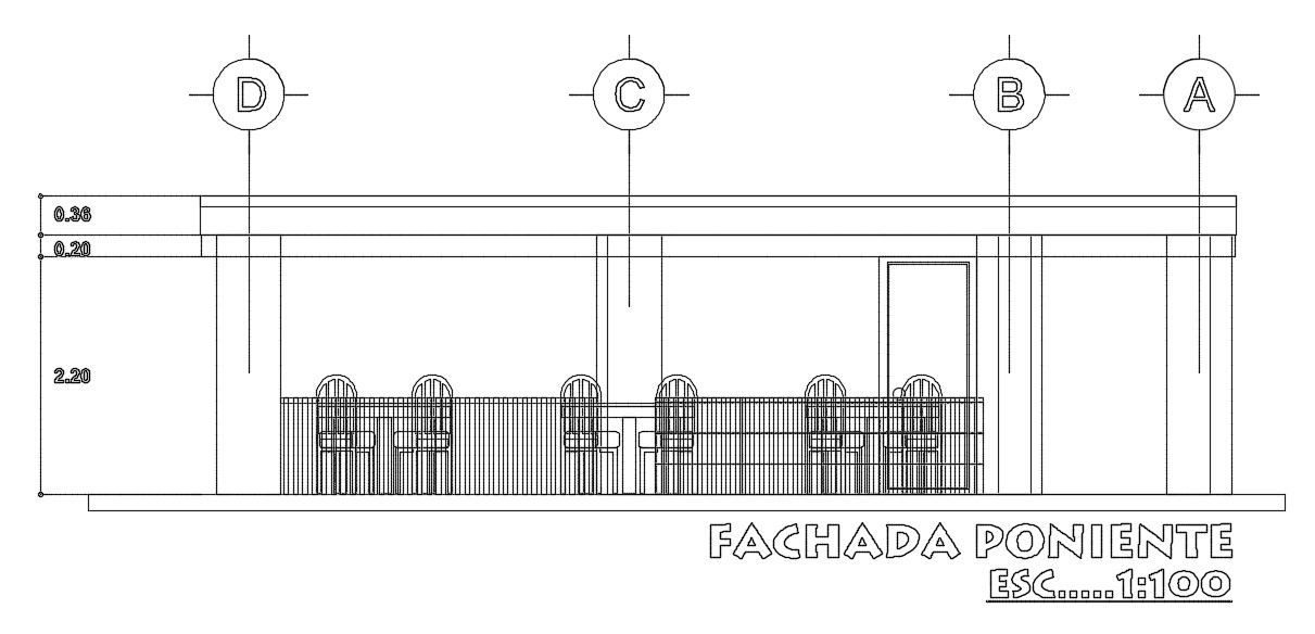 The main elevation view of the 9x18m restaurant building is given in this AutoCAD drawing model. Download now.