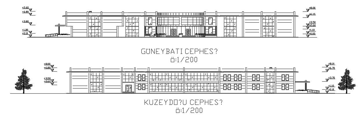 The front and back side elevation view of 70x62m primary school building is given in this AutoCAD drawing model.