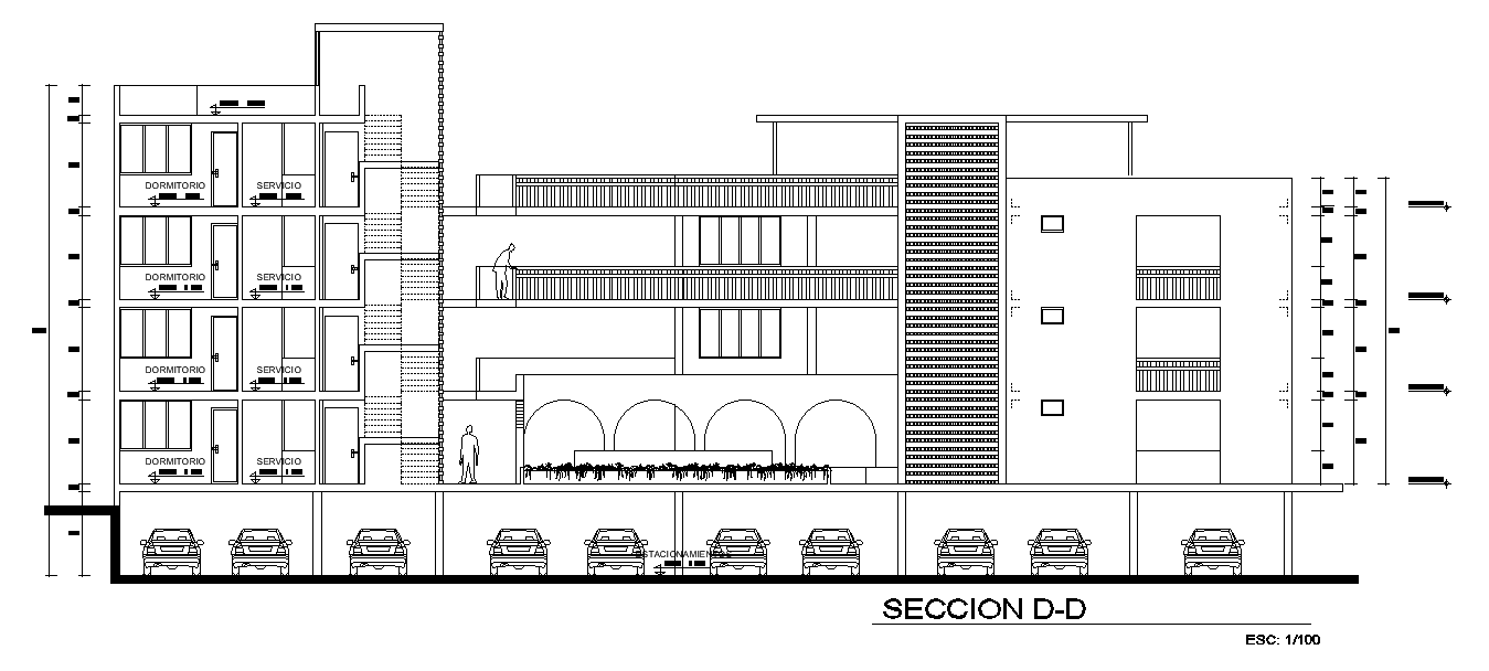 The front side section view of the 35x27m house building is given in this AutoCAD drawing model. Four houses are available on this house plan. This is G+ 3 house building. A kitchen, dining area, study room, hall, master bedroom with an attached bathroom, and common bathrooms are available. For more details download the AutoCAD drawing file. Thank you for downloading the AutoCAD drawing file and other CAD program files from our website.