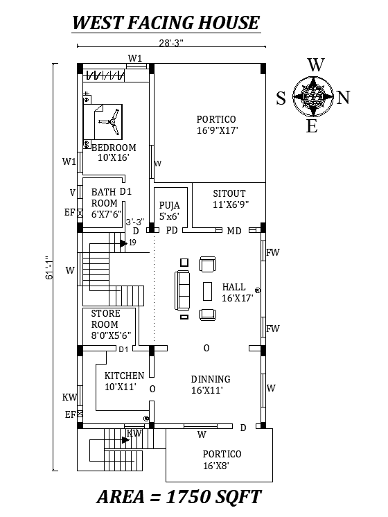 West facing house design as per Vastu shastra is given in this cad file. The total built-up area of the plan is 1750 sqft. In this floor plan, there is a kitchen, dining, storeroom, hall, puja, portico, bedroom with an attached toilet, and sit out are given in this cad file. Download this cad file now.
