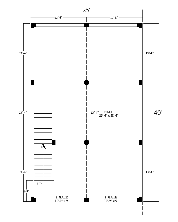 25'x40' hall cad drawing is given in this cad file. There is a 2d floor plan is available. In this floor plan, there is column detail and a stair case is available. Download this cad file now.