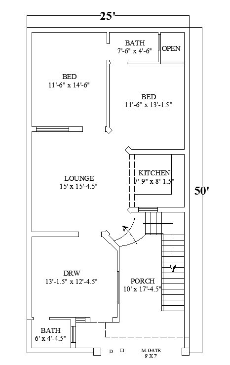 25'x50' home design cad drawing is given in this cad file. There is a 2d floor plan is available. In this cad file, there is a master bedroom with an attached toilet, bedroom, kitchen, lounge, toilet, drawing-room, and the porch is available. Download this 2d cad file now.