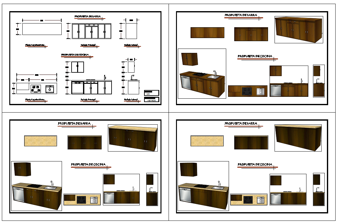 Kitchen cabinet detail drawing include 3d detail, sections and all side elevations of kitchen cabinet.