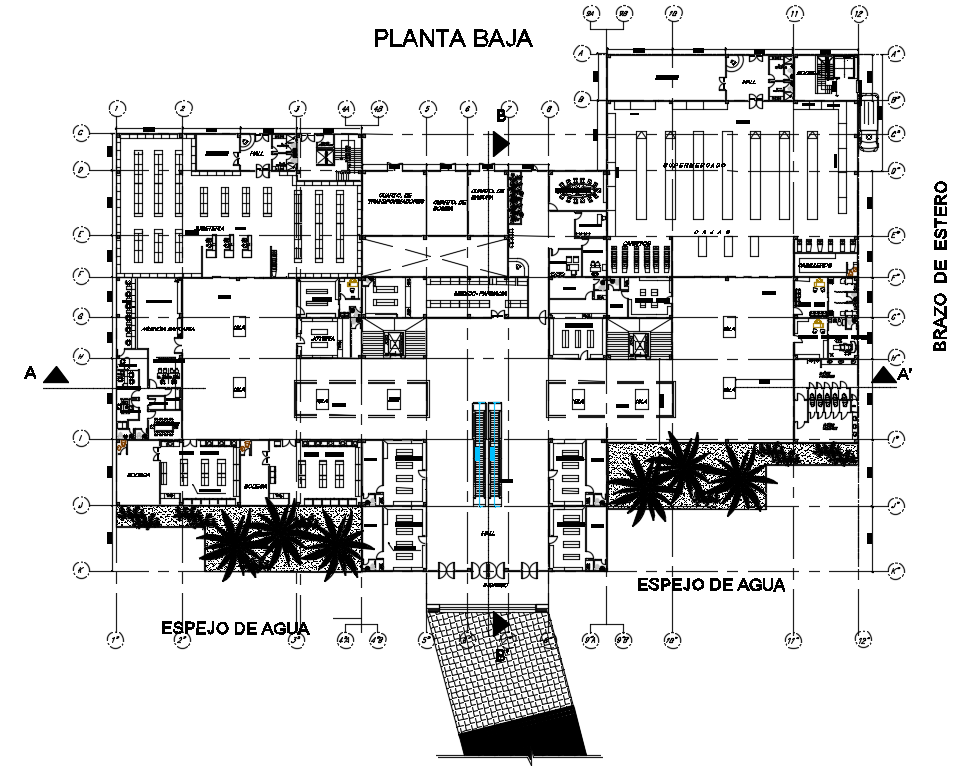 Modern public building floor plan design cad drawing is given in this cad file. Download this cad file now.