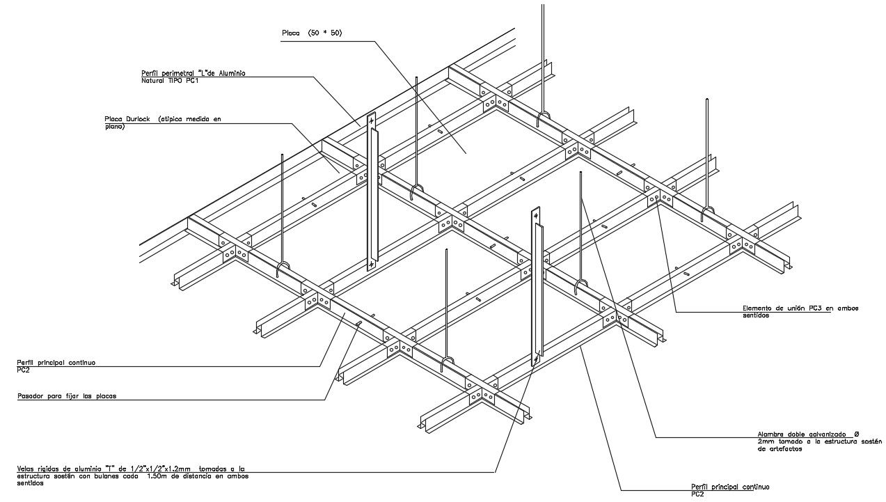 the ceiling rigid aluminum cad drawing that shows "T" candles of 1/2 "x1 / 2" x1.2mm taken to the supporting structure with bolts every 1.50m distance in both directions, Pin to fix the plates, 2mm galvanized double wire taken to the supporting structure of artifacts detail in dwg file. For more details download the Autocad file. Thank you for downloading the Autocad file and other CAD program files from our website.
