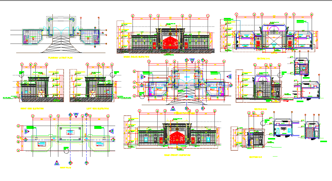 Main Gate Structure detail. FLOORING LAYOUT PLAN, INSIDE (REAR) ELEVATION, SECTION A-A, RIGHT SIDE ELEVATION, LEFT SIDE ELEVATION, ROOF PLAN, etc
