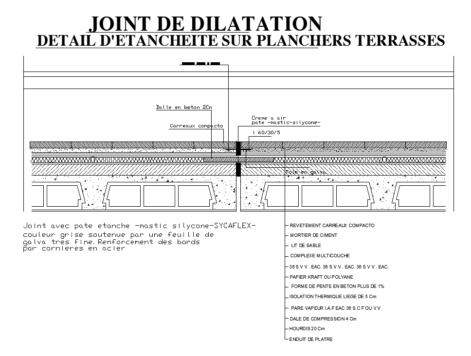 Waterproofing detail on terraced floors and expansion joint CAD section detailed plan. Download now.