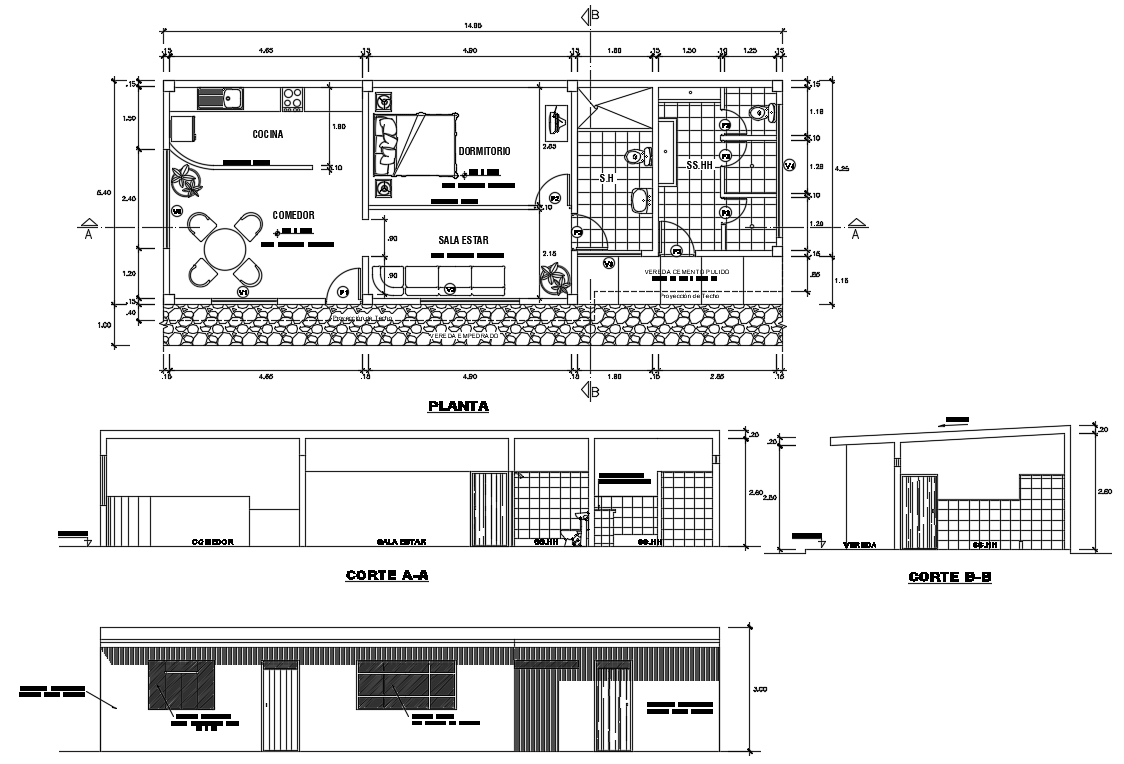 Modern small house cad drawing is given in this cad file. There is a 2d floor plan, detailed sections and elevation are available. In this cad drawing, there is a living area, dining, kitchen, and washroom is available. and there is section A-A and section B-B and also the front view is available. Download this cad file now.