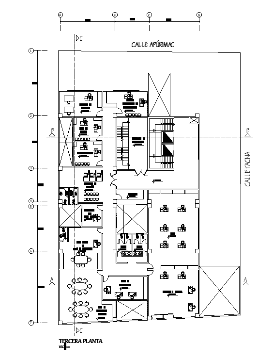 Public building third-floor plan cad drawing is given in this cad file. Download this cad file now.