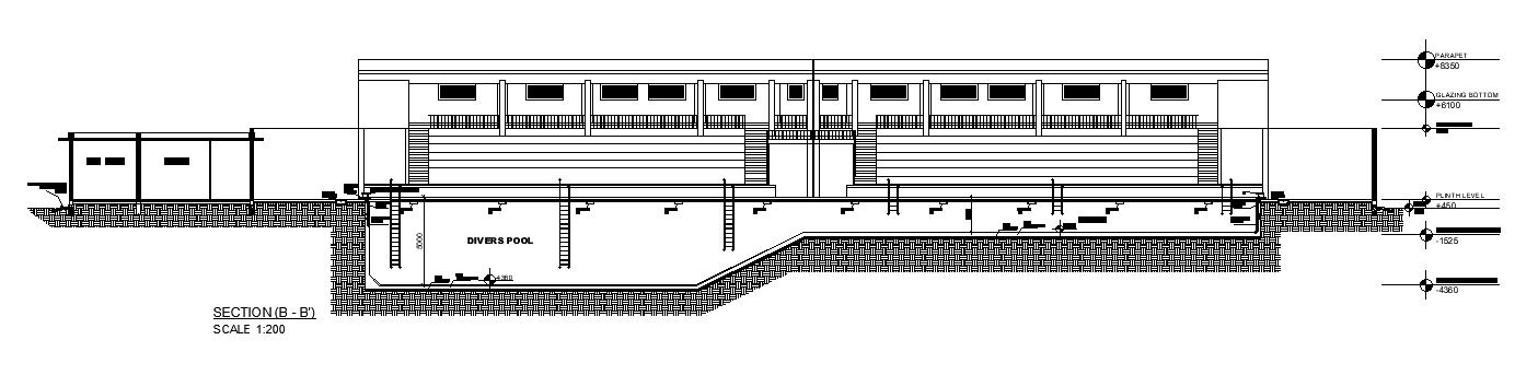 The back side section view of the 73x50m swimming pool is given in this AutoCAD drawing model. This is a large unit swimming pool plan. The diving tower is provided in this plan. Officer’s zone, pump house, gent’s toilet, ladies toilet, male changing room, female changing room, shower, spring board, and sitting stands are available on this swimming pool plan. For more details download the AutoCAD drawing file. Thank you for downloading the AutoCAD drawing file and other CAD program files from our website.