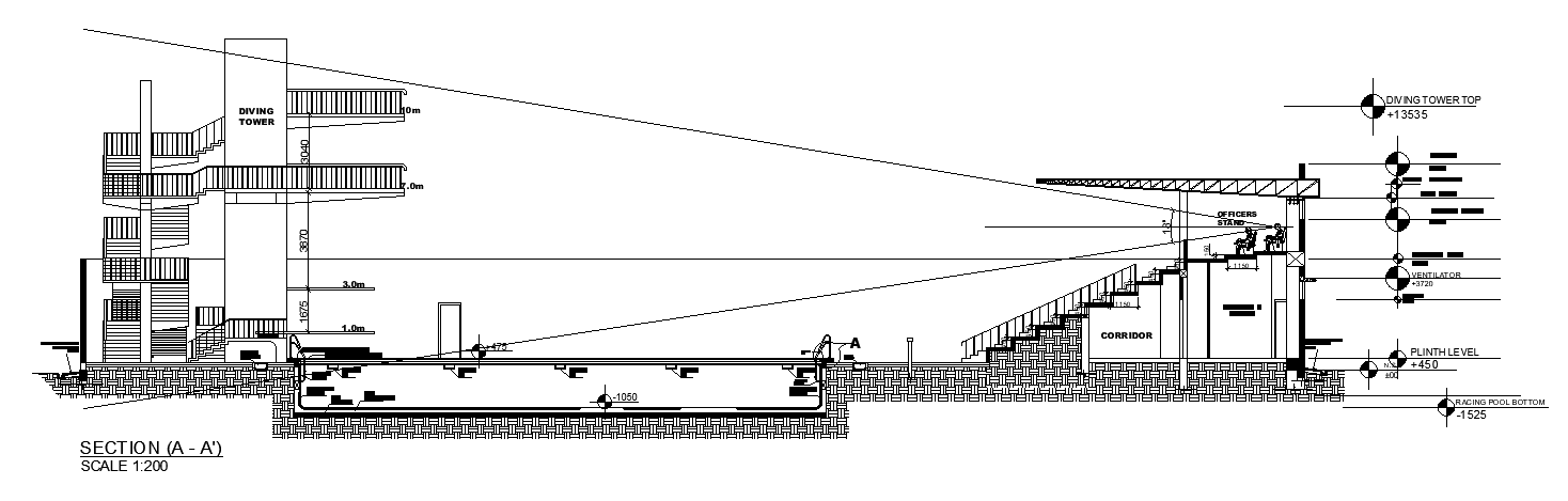 A section view of the 73x50m swimming pool is given in this AutoCAD drawing model. This is a large unit swimming pool plan. The diving tower is provided in this plan. Officer’s zone, pump house, gent’s toilet, ladies toilet, male changing room, female changing room, shower, spring board, and sitting stands are available on this swimming pool plan. For more details download the AutoCAD drawing file. Thank you for downloading the AutoCAD drawing file and other CAD program files from our website.