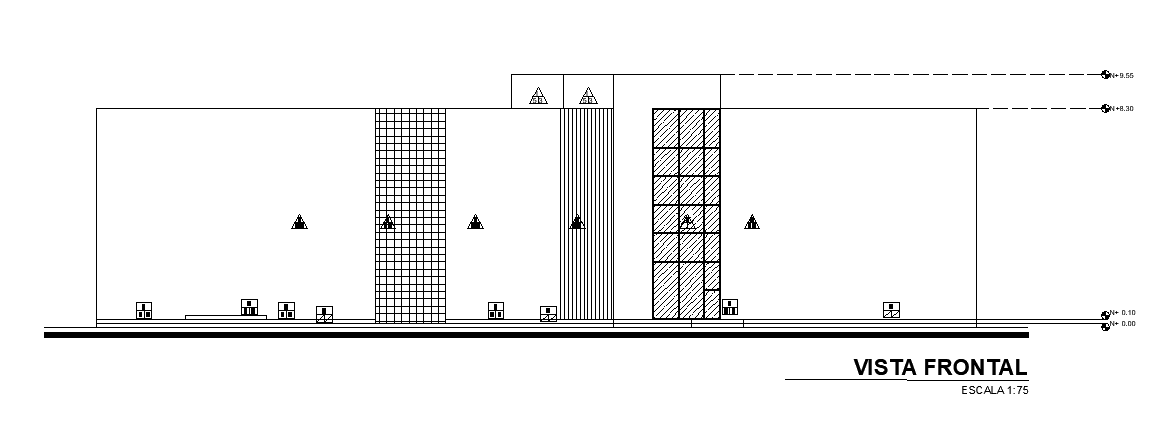 The front elevation view of the 34x21m architectural office building is given in this AutoCAD drawing model.