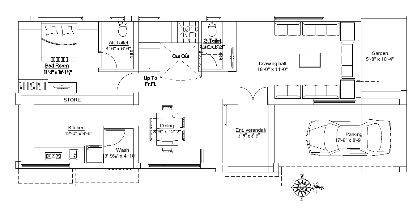 25x60 house plan ground floor is given in this AutoCAD drawing model. This is G+ 2 house building. Garden, car parking, drawing hall, bedroom with an attached toilet, kitchen, storeroom, wash area, common toilet and dining area are available on this house design. For more details download the AutoCAD drawing file. Thank you for downloading the AutoCAD drawing file and other CAD program files from our website.