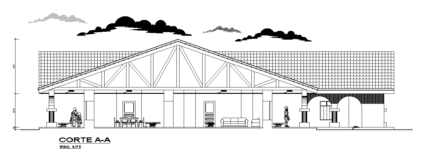 The front section view of the 40x28m house building is given in this AutoCAD drawing model. This is single story house building with 6.1m in height. A kitchen, dining area, breakfast dining, master bedroom with an attached toilet, kid’s room with an attached toilet, and common bathroom are available on this house plan. And also, a guest room with an attached toilet, two kid’s rooms with an attached toilet, and maid rooms are available. For more details download the AutoCAD drawing file. Thank you for downloading the AutoCAD drawing file and other CAD program files from our website.