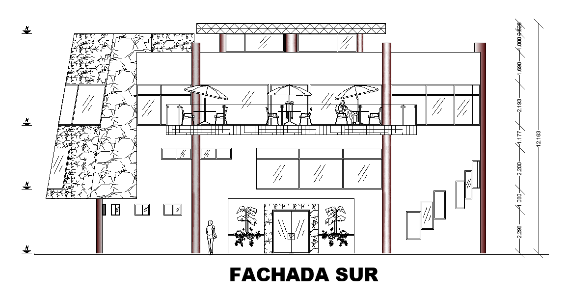 The south side elevation view of the 20x18m clubhouse building is given in this AutoCAD drawing model.