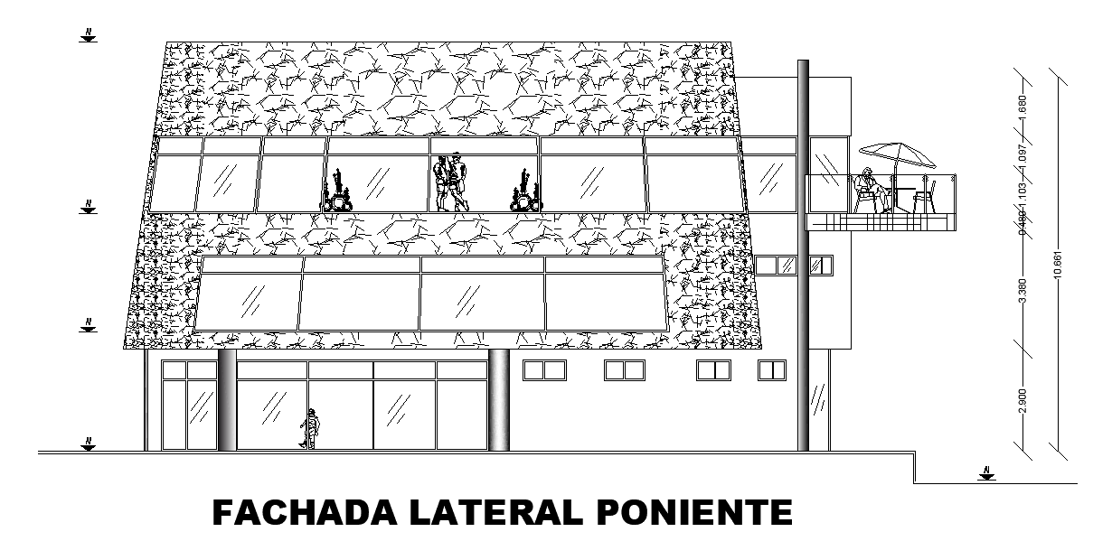 The lateral elevation view of the 20x18m club house building is given in this AutoCAD drawing model.