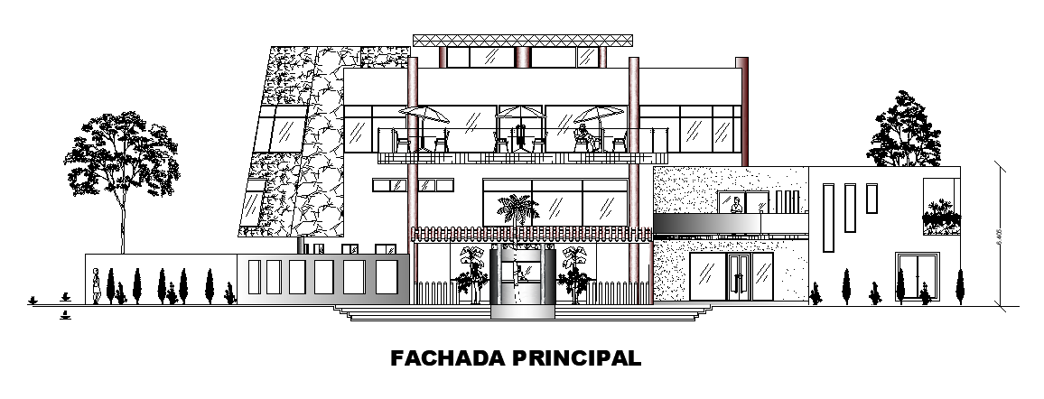The main elevation view of the 20x18m club house building is given in this AutoCAD drawing model.