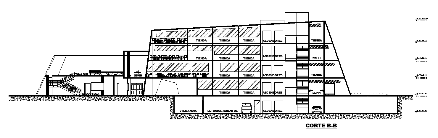 The front side section of the 68x32m commercial building is given in this AutoCAD drawing model. This is G+ 4 commercial building elevation. Car parking, drive way, control room, and electric room, cafeteria, restaurant, office area, male toile, female toilet, shops, stores, dining area, conference room, and receptions are available on this commercial shop plan. For more details download the AutoCAD drawing file. Thank you for downloading the AutoCAD drawing file and other CAD program files from our website.