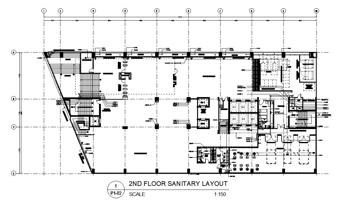 Commercial building second-floor sanitary layout cad drawing is given in this cad file. Download this 2d cad drawing now.