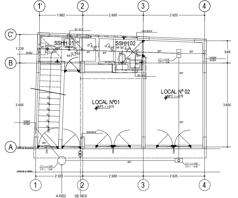 The commercial shop floor plan AutoCAD drawing that shows 2 shop on ground floor with an attached toilet with center line plan, and staircase detail in dwg file. Download architecture shop floor plan dwg file,