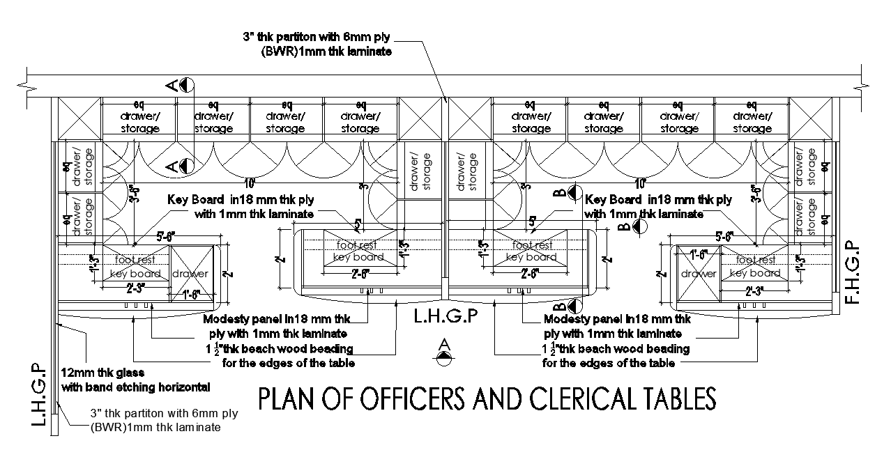 A layout of the officers & clerical tables are given in this AutoCAD drawing model. Drawer and storages are available on this plan. The dimension details are mentioned clearly in this file. For more details download the AutoCAD drawing file. Thank you for downloading the AutoCAD drawing file and other CAD program files from our website.