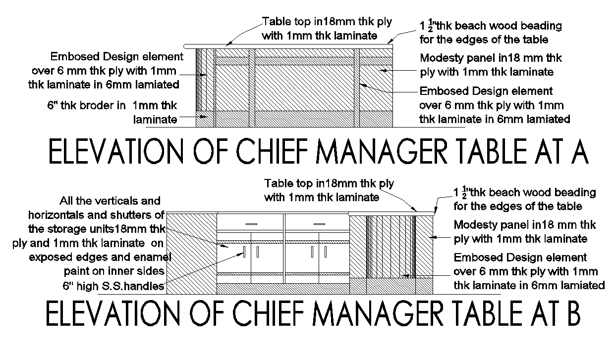 An elevation view of the chief manager table is given in this AutoCAD drawing model. Material details are specified in this model. Footrest, drawer, storage, system table, and chair is available on this chief manager room. For more details download the AutoCAD drawing file. Thank you for downloading the AutoCAD drawing file and other CAD program files from our website.