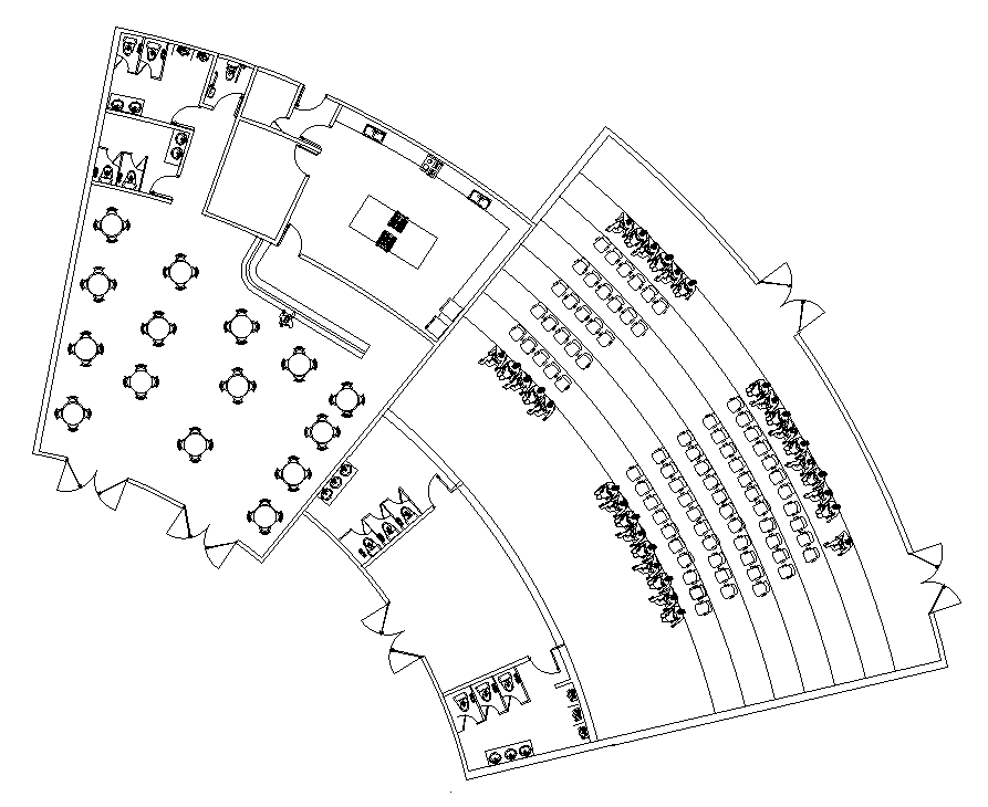 Semi circular building first-floor plan is given in this cad file. There is a 2d floor plan is available. In this cad file, there is a theater hall and a restaurant is available. For more 3d or 2d cad drawings visit our website cadbull.com. Download this 2d cad file now.