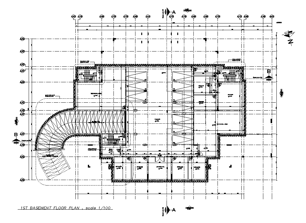 52x37m basement floor office CAD drawing is given in this AutoCAD model. Download now.