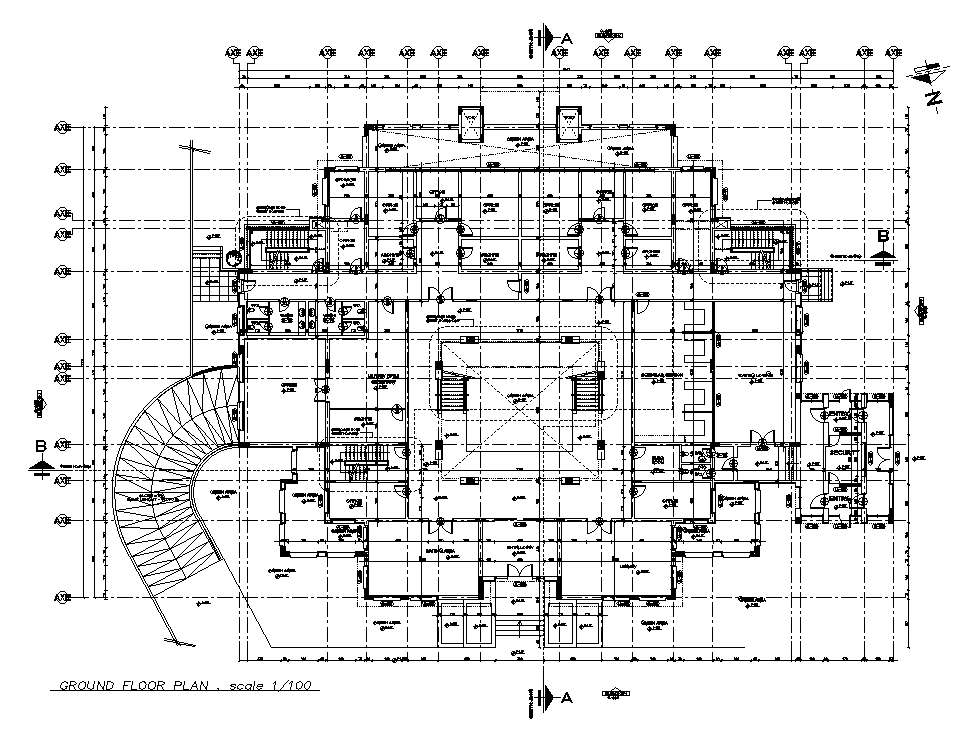 52x37m commercial building ground floor office CAD drawing is given in this AutoCAD model. Download now.