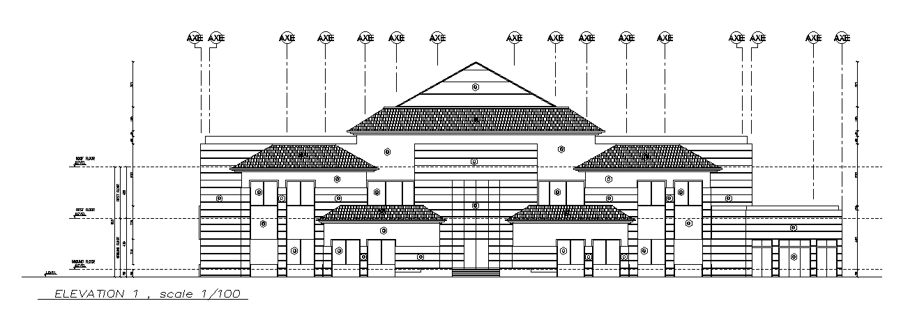 The front side elevation view of the 52x37m commercial building is given in this AutoCAD drawing model. Download now.