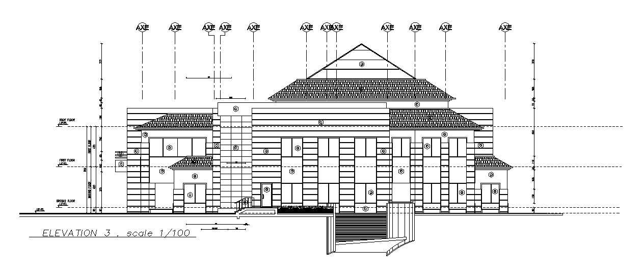 The back side elevation view of the 52x37m commercial building is given in this AutoCAD drawing model. Download now.
