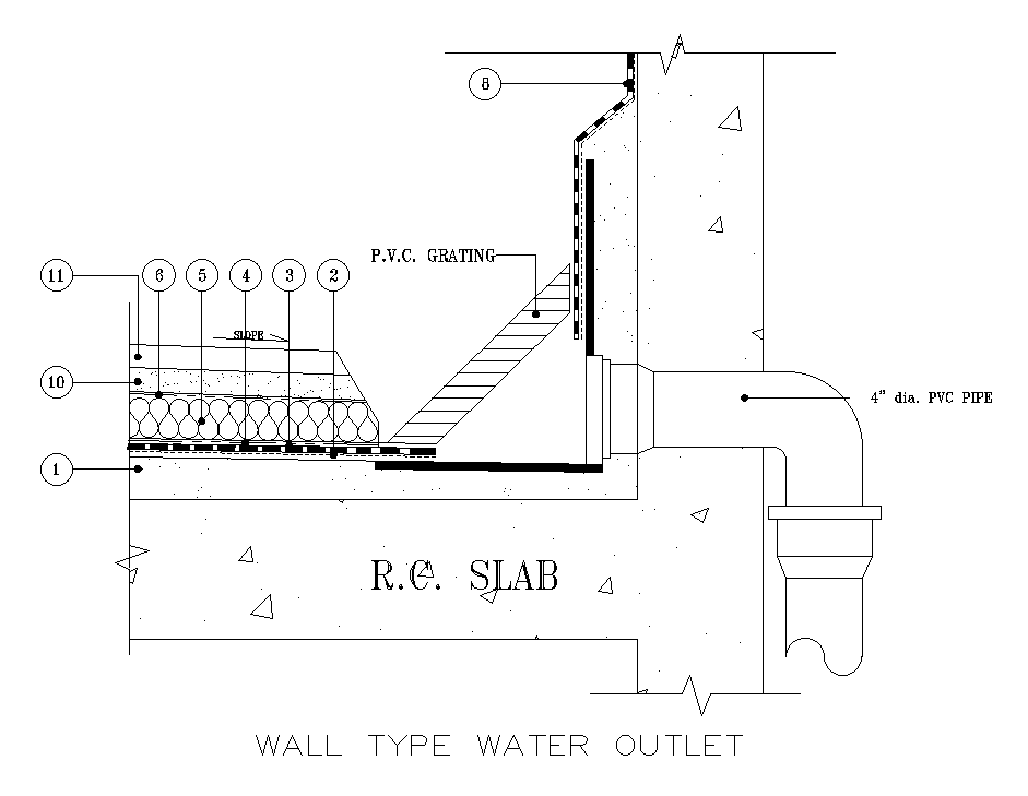 Wall type water outlet detail drawing is given in this AutoCAD model. 4” dia PVC pipe is provided. 150mm thickness of the RCC slab is provided. For more details download the AutoCAD drawing file. Thank you for downloading the AutoCAD drawing file and other CAD program files from our website.