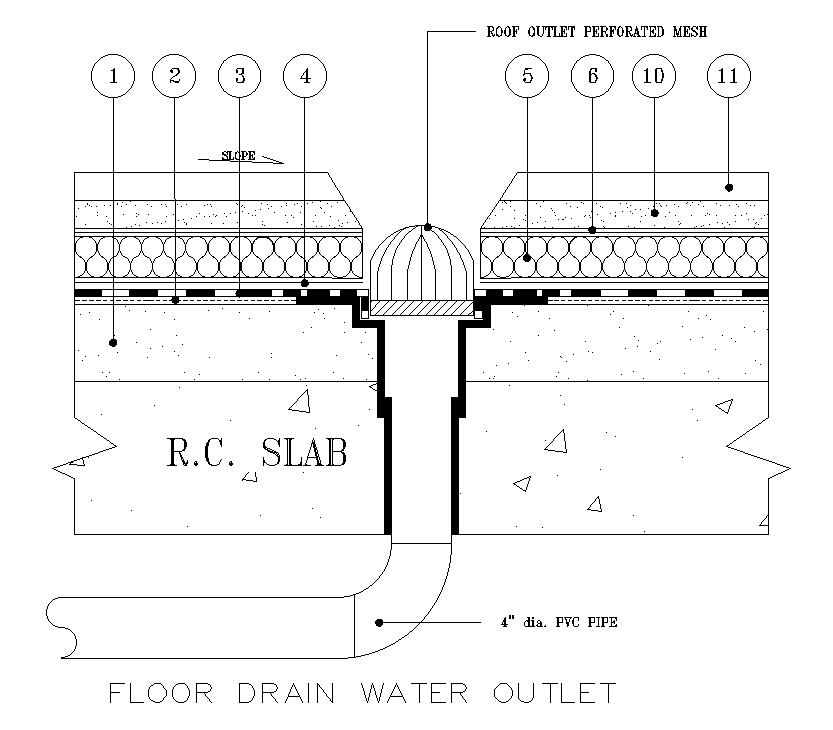 The floor drain water outlet detail drawing is given in this AutoCAD file. Roof cutlet perforated mesh is mentioned at the top of the drain. 4” dia PVC pipe is provided. For more details download the AutoCAD drawing file. Thank you for downloading the AutoCAD drawing file and other CAD program files from our website.
