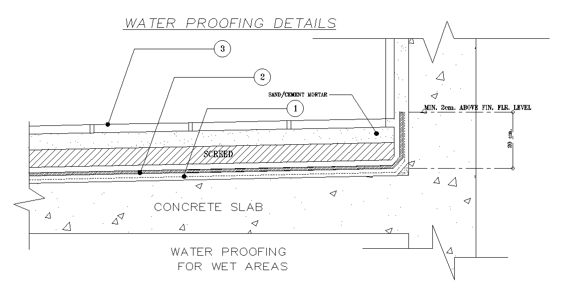 Water proofing for wet areas detail drawing is given in this AutoCAD drawing model. 150mm thickness of the concrete slab is provided. 6cm thickness of the screed is provided. For more details download the AutoCAD drawing file. Thank you for downloading the AutoCAD drawing file and other CAD program files from our website.