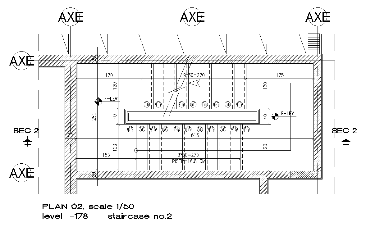 A +178 level of the 600x310cm staircase plan is given in this AutoCAD model. Totally 9 risers are provided. The width of the thread is 300mm. The thickness of the riser is 168mm. For more details download the AutoCAD drawing file. Thank you for downloading the AutoCAD drawing file and other CAD program files from our website.