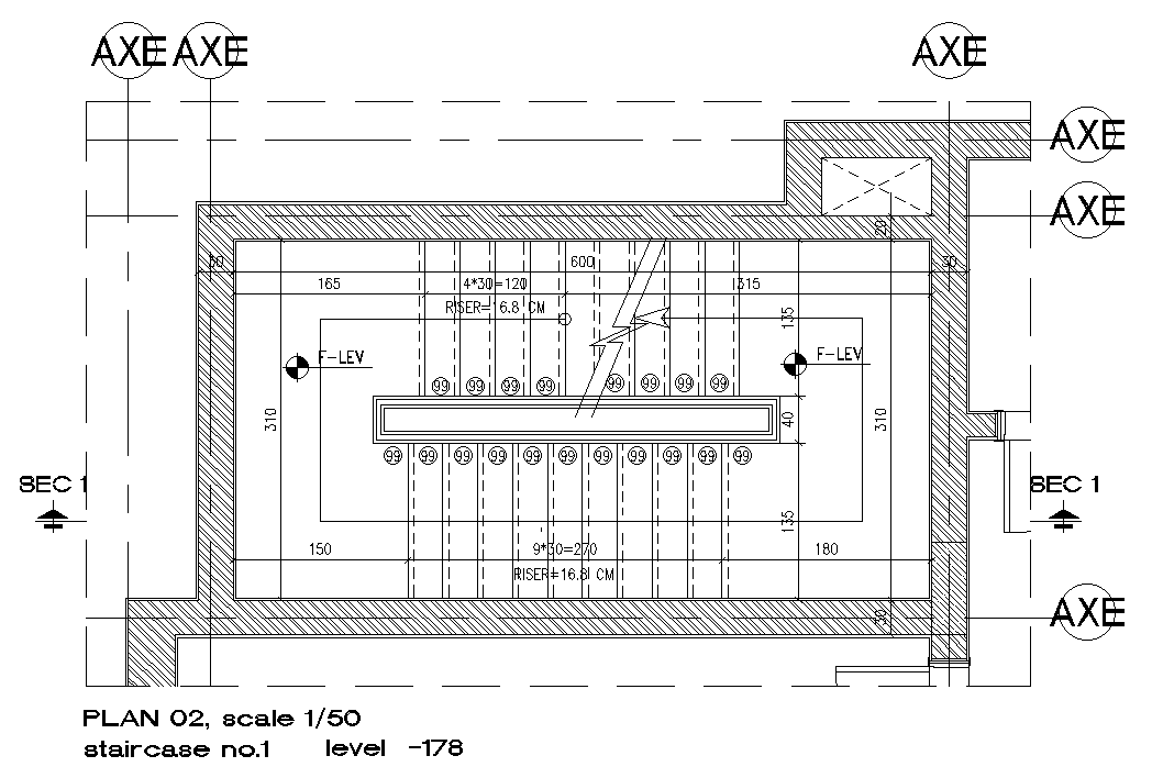 178 level of the 600x310cm staircase plan is given in this AutoCAD model. The width of the thread is 300mm. The thickness of the riser is 168mm. For more details download the AutoCAD drawing file. Thank you for downloading the AutoCAD drawing file and other CAD program files from our website.