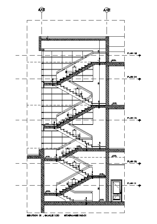 52x37m commercial building of the right side staircase section view has been given in this AutoCAD model. The total height of the staircase is 14m. The width of the thread is 300mm. The thickness of the riser is 168mm. For more details download the AutoCAD drawing file. Thank you for downloading the AutoCAD drawing file and other CAD program files from our website.