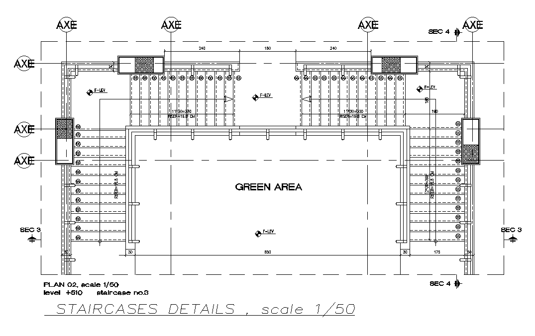 600x310cm staircase detail plan is given in this AutoCAD model. The width of the thread is 300mm. Download now.