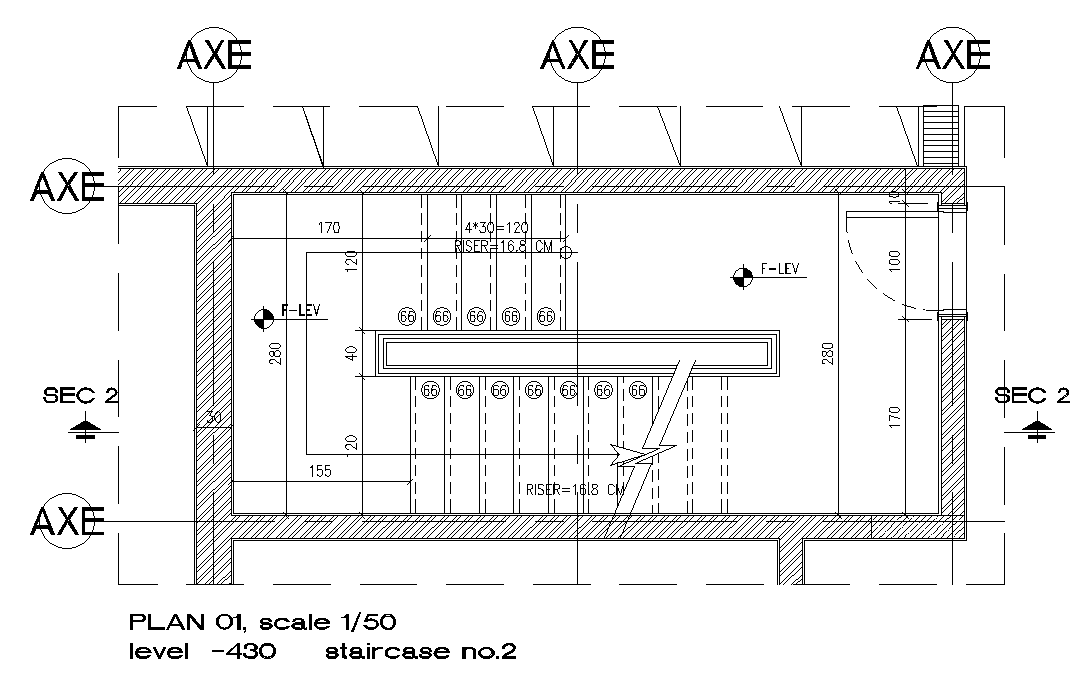 A +430 level of the 600x310cm staircase plan is given in this AutoCAD model. Totally 4 risers are provided on the right side. The width of the thread is 300mm. The thickness of the riser is 168mm. For more details download the AutoCAD drawing file. Thank you for downloading the AutoCAD drawing file and other CAD program files from our website.