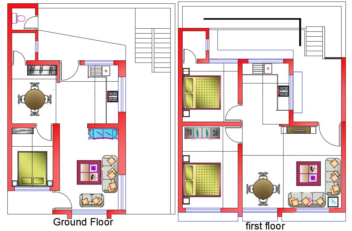 Modern house plan cad drawing is given in this cad file. There are 2d floor plans are available. In this ground floor plan, there is a living room, kitchen, dining, toilet, and bedroom is available and on the first floor, there is a bedroom, master bedroom with attached toilet, kitchen, dining, and living room is available. Download this 2d cad file now.