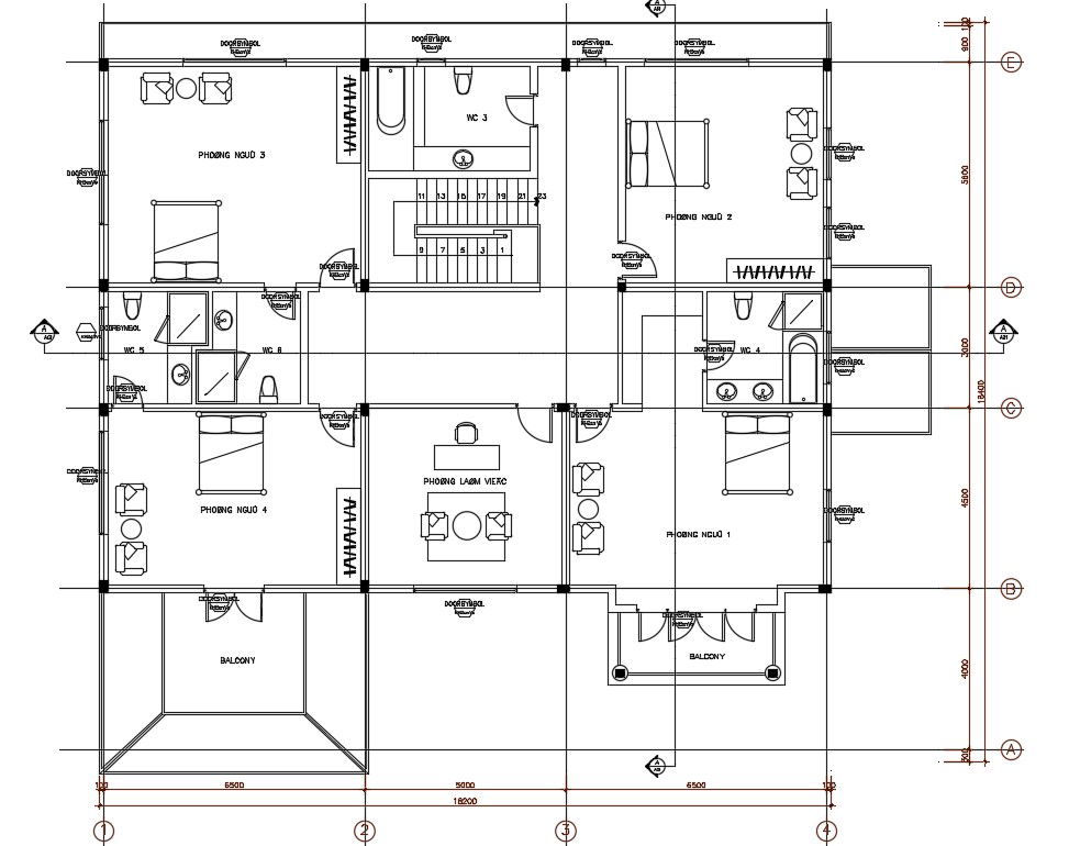 Bungalow design cad drawing is given in this cad file. There is a 2d floor plan is available. In this first-floor plan master bedroom with attached balcony, dressing, and toilet, common toilet, study room, bedroom, guest bedroom with attached toilet, kids bedroom with attached toilet and balcony is available. Download this 2d Auto cad file.