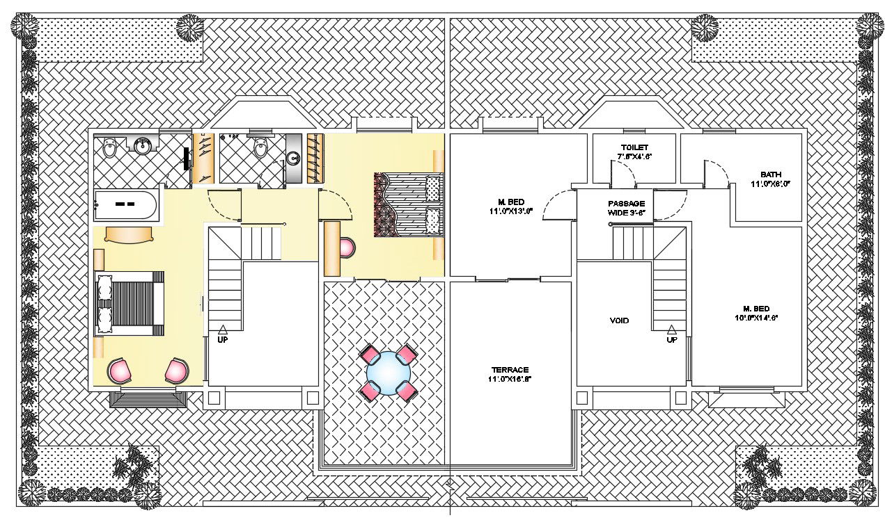 Aesthetic twin house floor plan is given in this cad file. There is a 2d first-floor plan is available. On this first floor, there is a master bedroom with an attached toilet, bedroom, and a common toilet is available. Download this 2d cad file now.