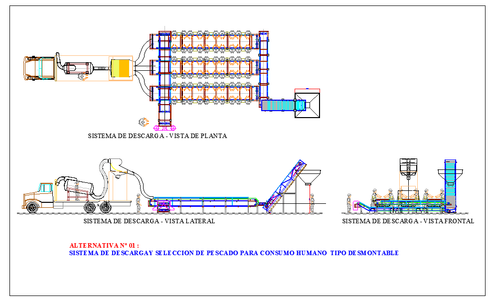 Discharge water system detail. System of discharge and selection of fish for human consumption type detachable, Discharge system - plant view, Discharge system - front view,