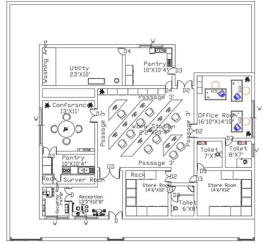The office design floor plan is given in this cad file. There is a 2d plan is available. In this cad file, there is an office room, storeroom with attached toilet, common toilet, passage, reception area, security room, server room, conference room, utility area, and pantry is available. Download this 2d Auto cad file now.