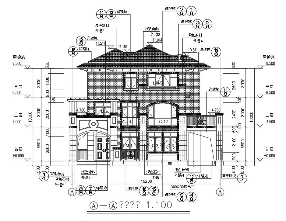 The residence modern house building front elevation design that shows entrance main gate, autocad brick wall hatching design, truss span roof, glass door window, and total building height is 10,000 mm with all dimension and center line detail in dwg file. Thank you for downloading the Autocad file and other CAD program files from our website.