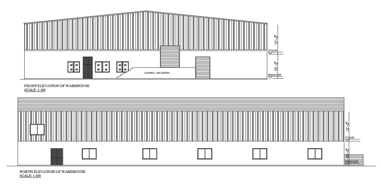 the warehouse building front and side elevation design specified an iron span roof detail with services, window marking, main gate and utilities detail plan given with dimension and specification. this can be used by architects and engineers. Thank you for downloading the Autocad drawing file and other CAD program files.