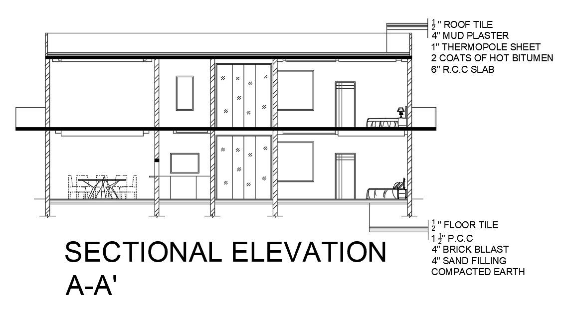 The residence house building section CAD drawing that shows RCC slab, brick bllast, sand filling compacted earth, and wall section detail in dwg file. also has cross section furniture bedrooms detail. Thank you for downloading the Autocad drawing file and other CAD program files.