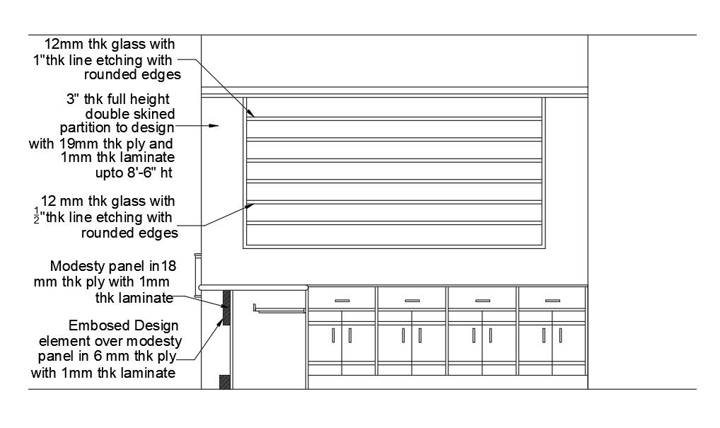The office furniture sectional elevation AutoCAD drawing that shows 12mm thk glass with 1"thk line etching with rounded edges, 3" thk full height double skined partition to design with 19mm thk ply and 1mm thk laminate upto 8'-6" ht and Modesty panel in18 mm thk ply with 1mm thk laminate. Thank you for downloading the Autocad drawing file and other CAD program files.